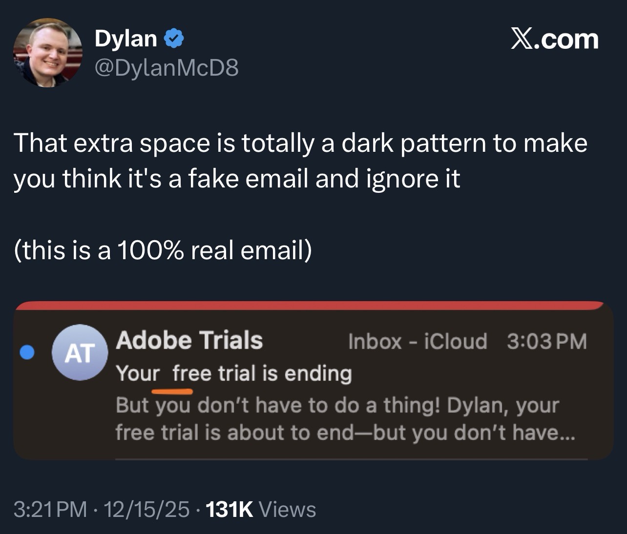 I started an adobe trial a few weeks back to be able to sign some legal documents, and then when I tried to cancel it early it said I was going to be charged a ‘$98 early cancellation fee’ which feels like it shouldn’t be legal. Thanks for coming to my ted talk.