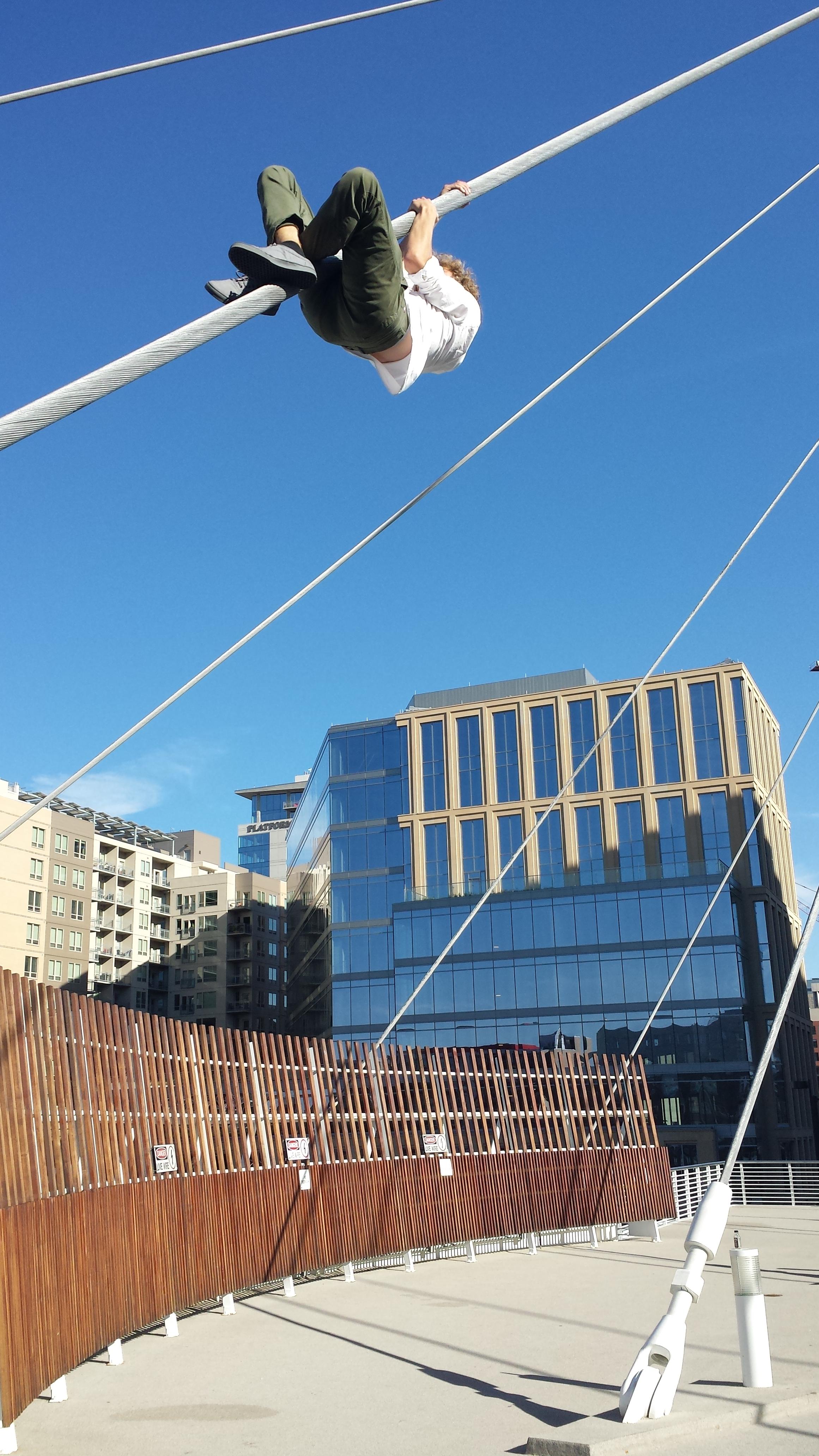 Probably 25 feet. He once climbed to the top of an industrial light pole. He gathered a crowd for that one.