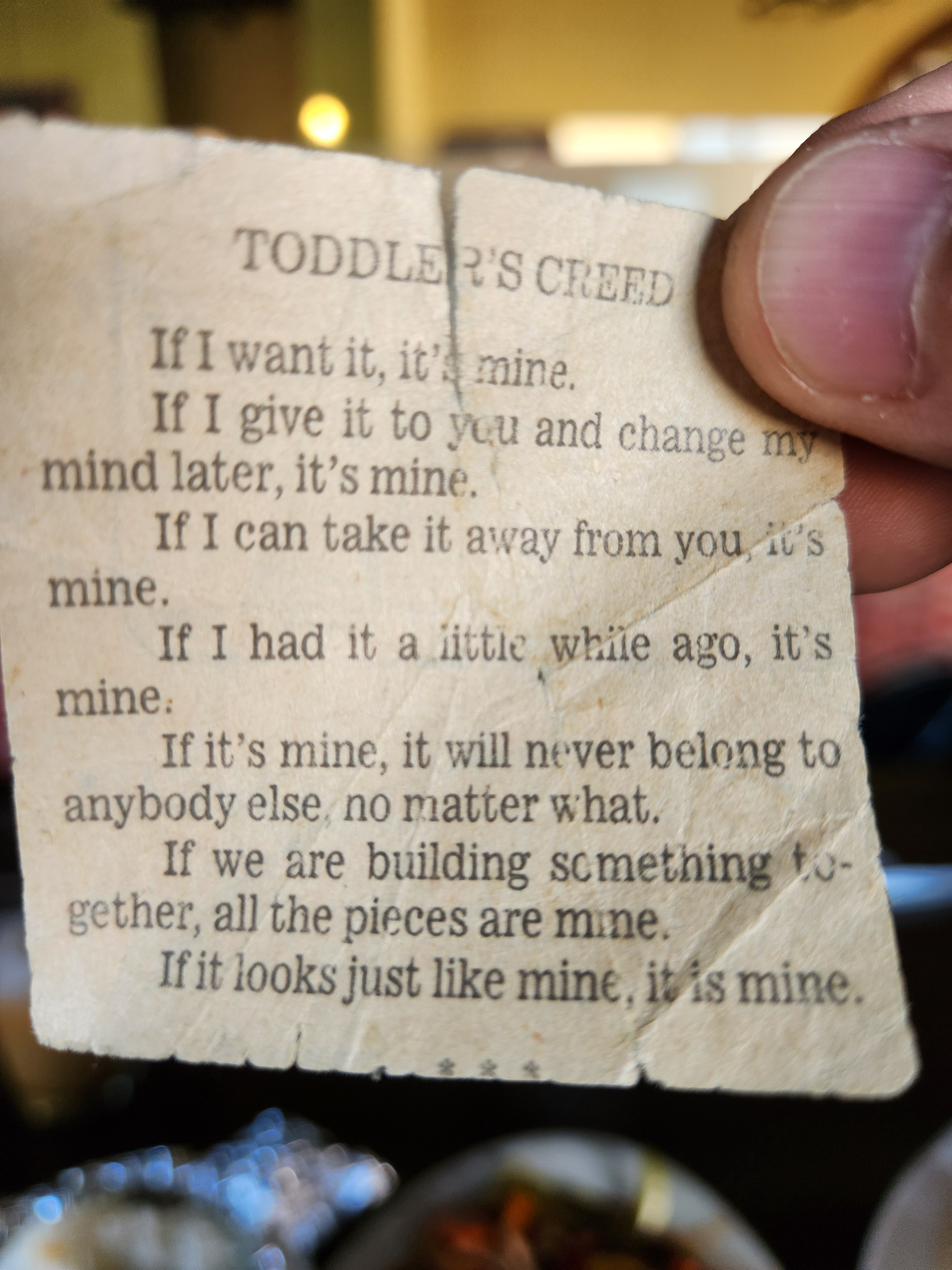 Telling my elderly mother about an epic toddler meltdown, and she pulls this gem out of her wallet.